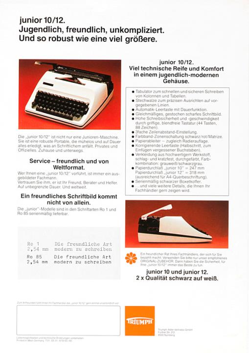 Prospekt für Schreibmaschine Triumph junior 10, 12 Die freundliche Art, schöner zu schreiben. Von Anfang an mit viel Komfort Nr. T.01.03.01/679/50/40
