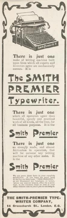 Werbeanzeige für Schreibmaschine Smith Premier monochrom