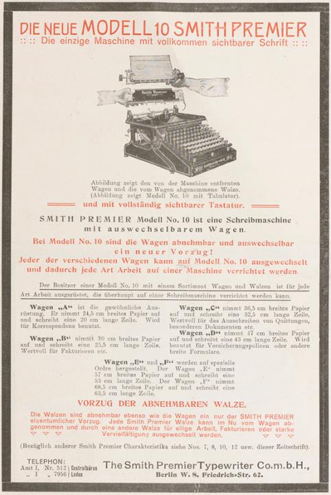 Werbeanzeige für Schreibmaschine Smith Premier polychrom
