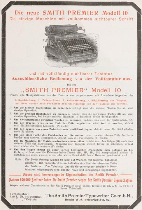Werbeanzeige für Schreibmaschine Smith Premier polychrom