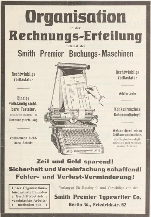 Werbeanzeige für Schreib- und Buchungsmaschine Smith Premier monochrom