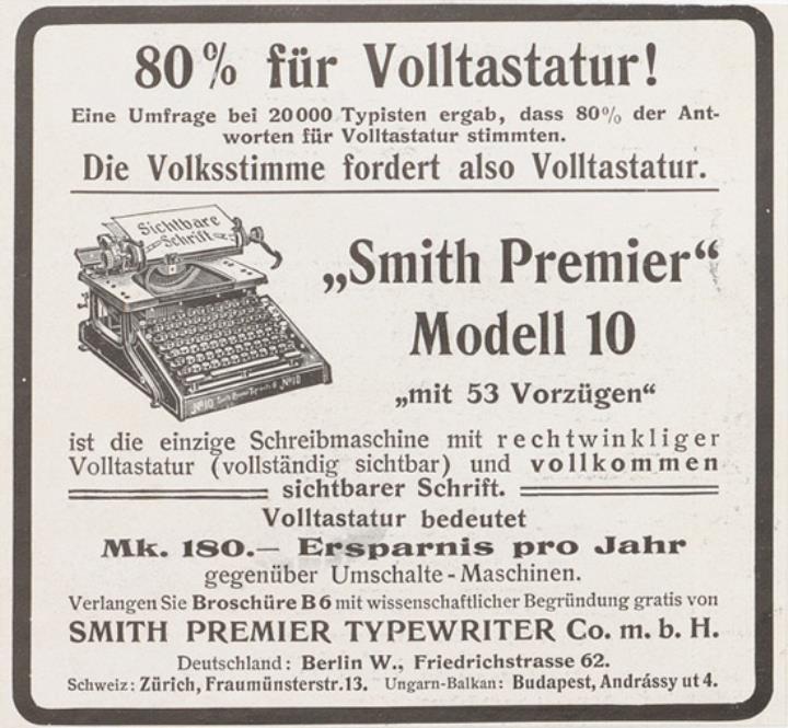 Werbeanzeige für Schreibmaschine Smith Premier monochrom