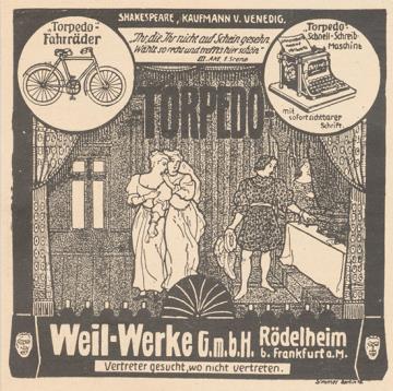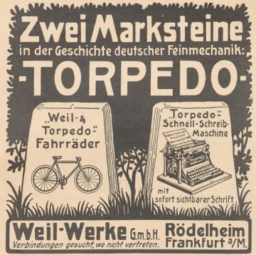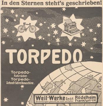 Werbeanzeige für Fahrrad und Schreibmaschine Torpedo monochrom