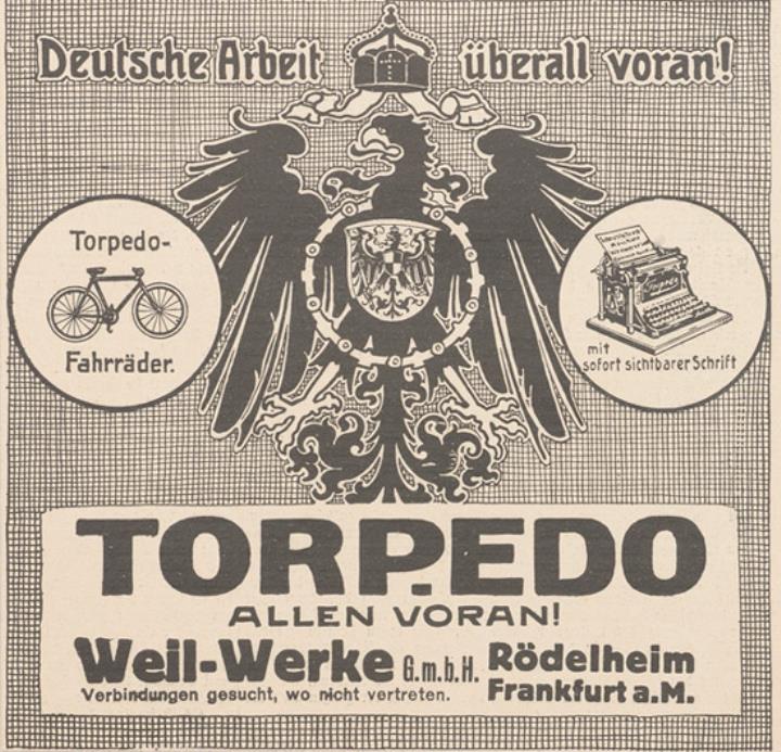 Werbeanzeige für Fahrrad und Schreibmaschine Torpedo monochrom