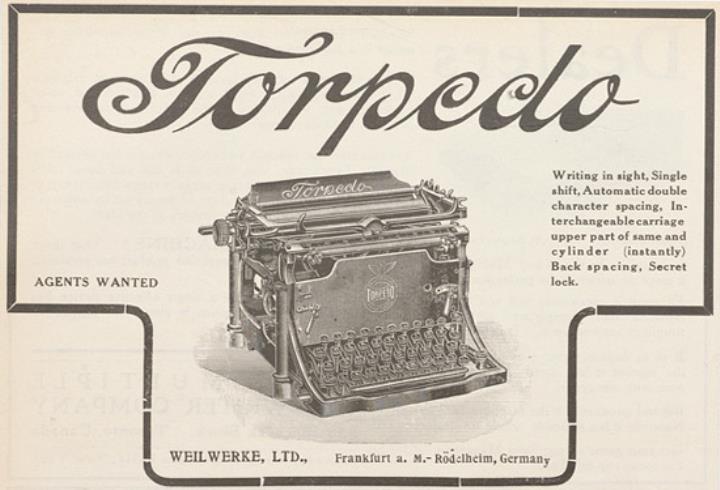 Werbeanzeige für Schreibmaschine Torpedo monochrom