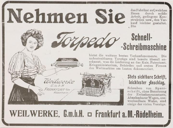 Werbeanzeige für Schreibmaschine Torpedo monochrom