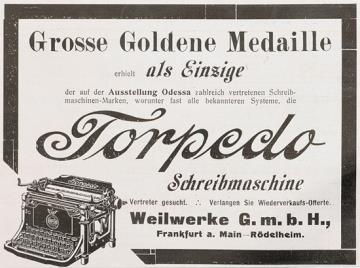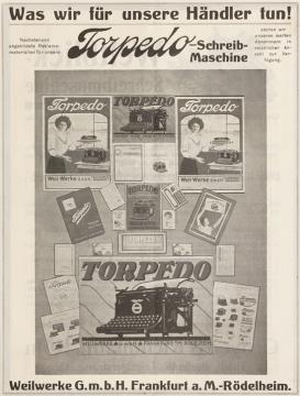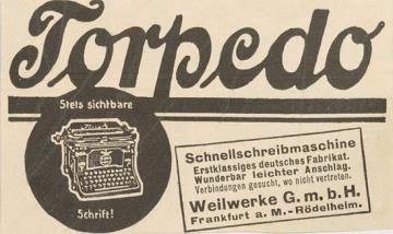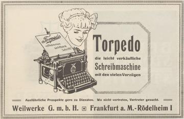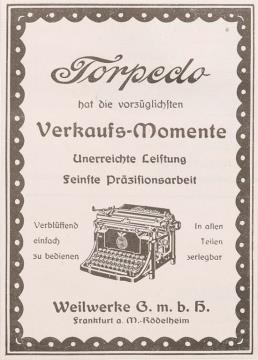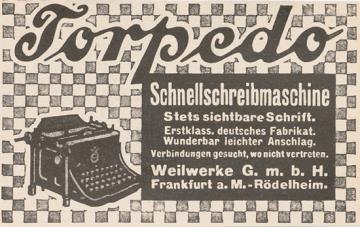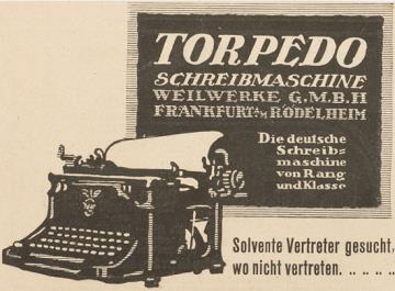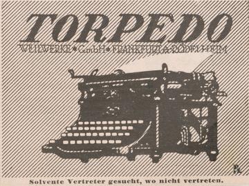 Werbeanzeige für Schreibmaschine Torpedo monochrom