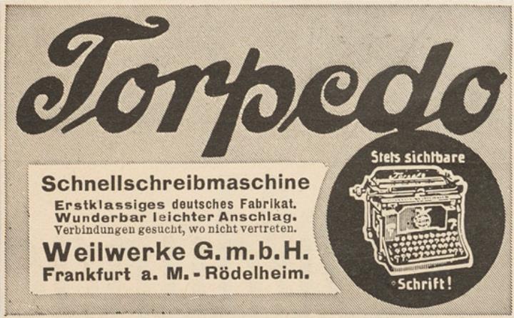 Werbeanzeige für Schreibmaschine Torpedo monochrom