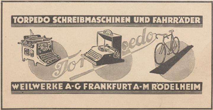 Werbeanzeige für Schreibmaschine und Fahrräder Torpedo monochrom