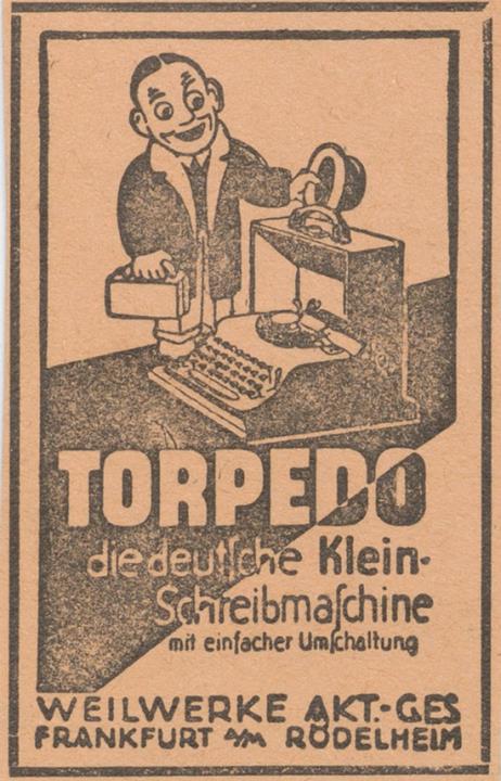 Werbeanzeige für Schreibmaschine Torpedo monochrom