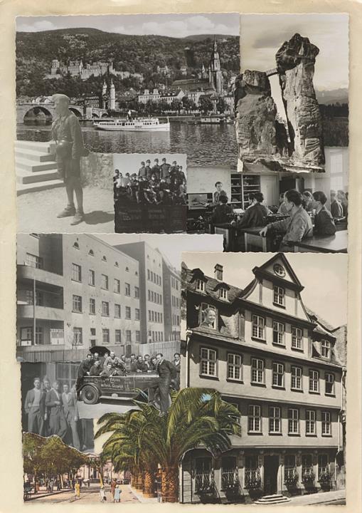 Mappe aus Papier; im Inneren eine Collage aus zehn Fotografien (monochrom) und einer Fotoansichtskarte (koloriert) verschiedene Ansichten, darunter Männer im Unterricht für Schreibmaschinenmechaniker