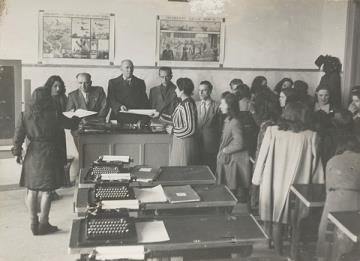 Fotografie, monochrom Ansicht Unterrichtsraum; Frauen/Schülerinnen und Männer/Lehrer bei der Diplomvergabe zum Abschluss eines Maschinenschreibkurses, an der Wand hängend Plakate mit militärischem Inhalt