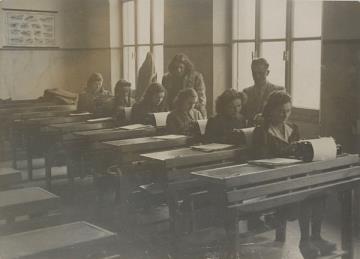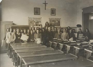 Fotografie, monochrom Ansicht Unterrichtsraum; Lehrerin/Lehrer und Schülerinnen mit Schreibmaschinen Rückseite mit Vermerk: Rovato
