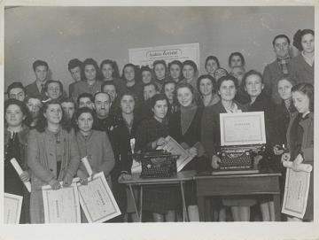 Fotografie, monochrom Schülerinnen/Schüler eines Maschinenschreibkurses (einige mit Diplom) posieren für ein Gruppenbild, zwei kleine Tische mit Schreibmaschinen, an der Wand hängend Tastaturschautafel Everest Rückseite mit Vermerk: Chiari