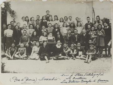 Fotografie, monochrom; Foto: Allegri Brescia Männer und Frauen eines Maschinenschreibkurses posieren für ein Gruppenbild, im Vordergrund Tisch mit Schreibmaschinen Rückseite mit Vermerk: Brescia, Dopolavoro Provinciale, Anno XX