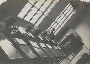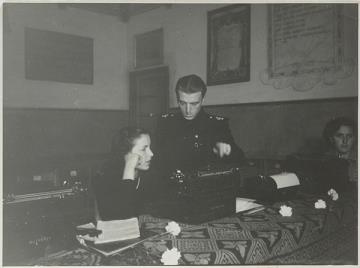 Fotografie, monochrom Ansicht Unterrichtsraum(?); zwei Frauen mit Schreibmaschine, stehend ein Mann in Uniform, Wand mit Dekormalerei Rückseite mit Vermerk: S. Remo