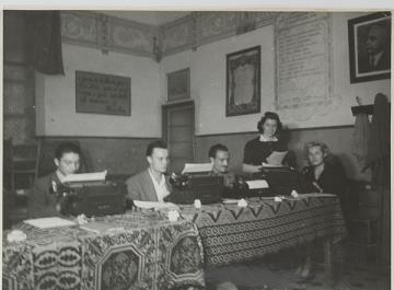 Fotografie, monochrom Ansicht Unterrichtsraum (?); drei Männer und zwei Frauen mit Schreibmaschine, Wand mit Dekormalerei und Zitat von B. Mussolini Rückseite mit Vermerk: S. Remo