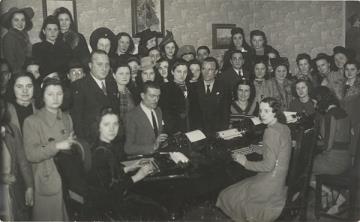 Fotografie, monochrom Lehrer und Schülerinnen/Schüler eines Maschinenschreibkurses posieren für ein Gruppenbild, in der Mitte ein kleiner Tisch mit Schreibmaschine; unterer Rand beschrieben