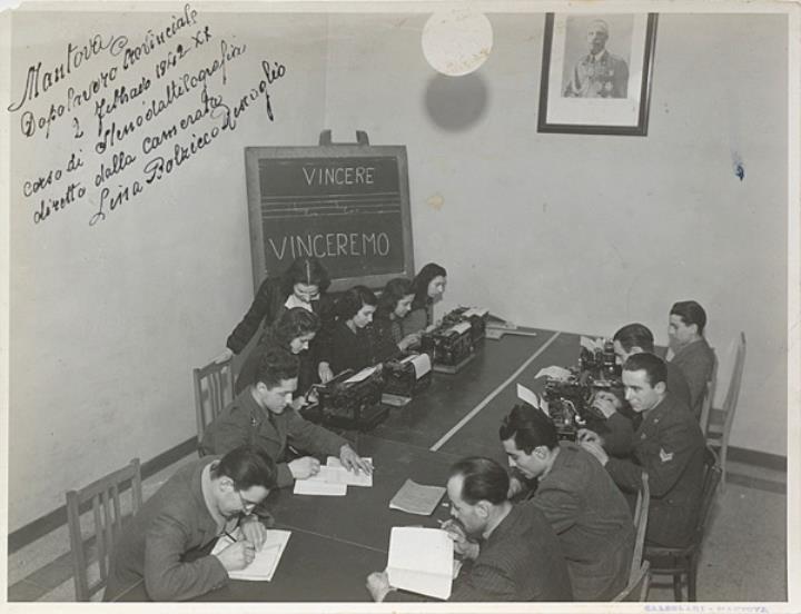 Fotografie, monochrom; Foto: Calzolari Mantova Ansicht Unterrichtsraum; Frauen und Männer, zwei davon in Uniform, mit Schreibmaschinen und Stenoheften; Stehtafel mit Aufschrift "Vincere-Vinceremo", Wand mit Porträtbild (Vittorio Emmanuele III) Rückseite: aufgeklebter Papierstreifen mit Beschreibungstext