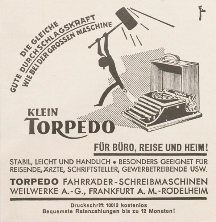 Werbeanzeige für Schreibmaschine Torpedo monochrom