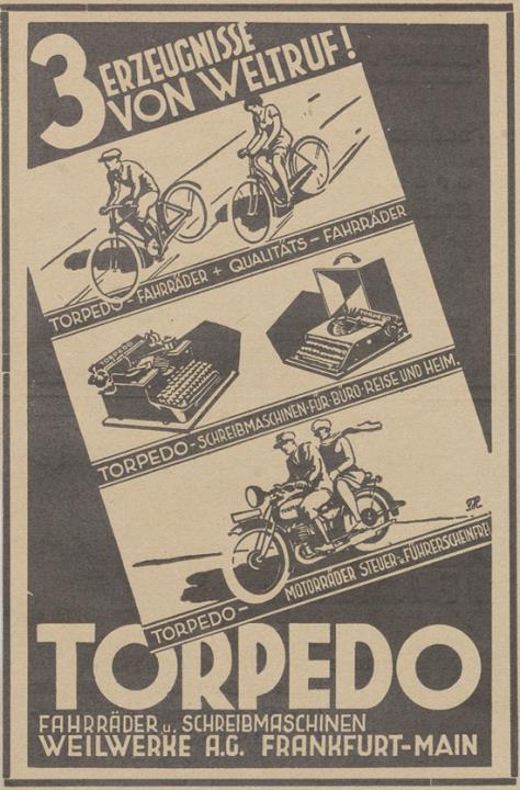 Werbeanzeige für Fahrrad, Schreibmaschine und Motorrad Torpedo monochrom