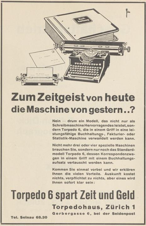 Werbeanzeige für Schreibmaschine Torpedo monochrom