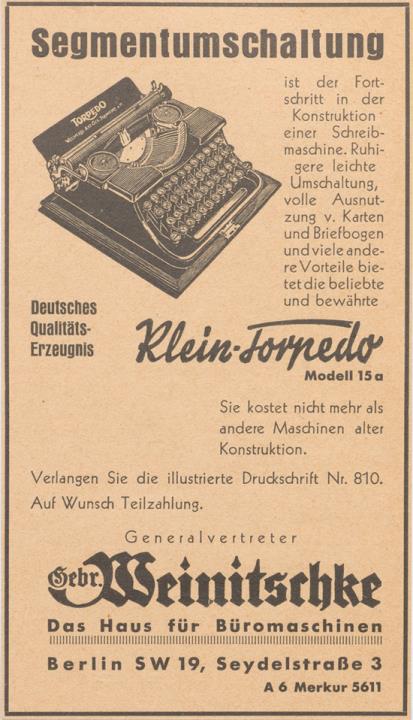 Werbeanzeige für Schreibmaschine Torpedo monochrom