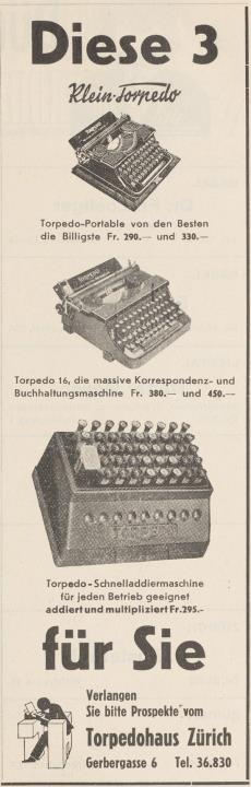 Werbeanzeige für Schreibmaschinen und Rechenmaschine Torpedo monochrom