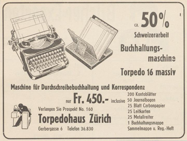 Werbeanzeige für Schreib- und Buchungsmaschine Torpedo monochrom