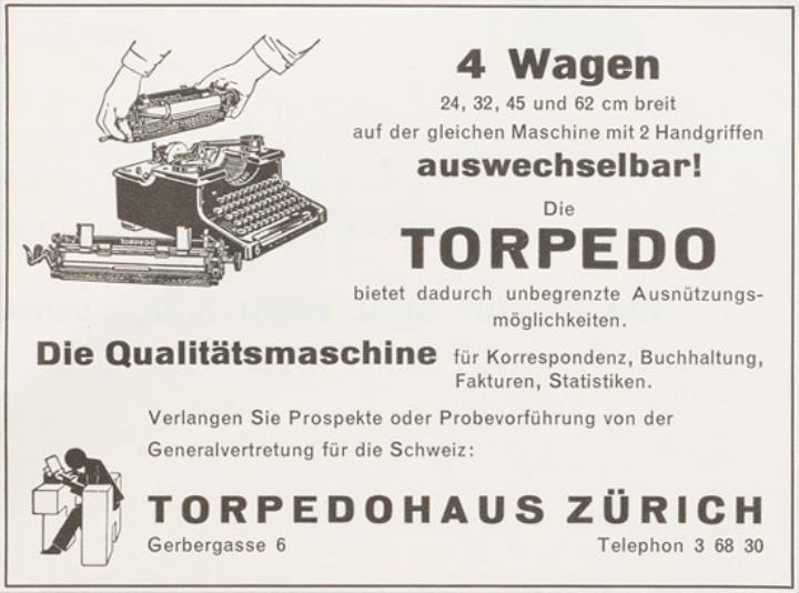 Werbeanzeige für Schreibmaschine Torpedo monochrom