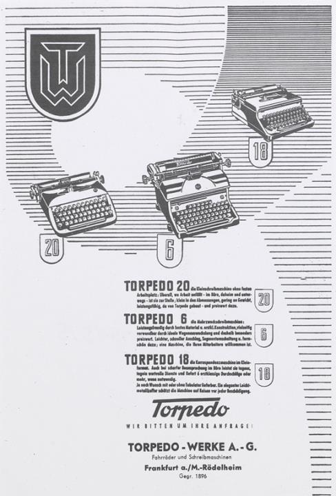 Werbeanzeige für Schreibmaschine Torpedo monochrom Fotokopie