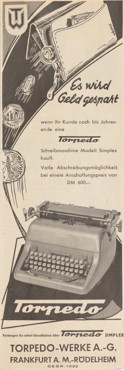 Werbeanzeige für Schreibmaschine Torpedo monochrom