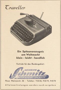 Werbeanzeige für Schreibmaschine Traveller monochrom; mit Stempel (Heinrich Schmitz, Frankfurt am Main)
