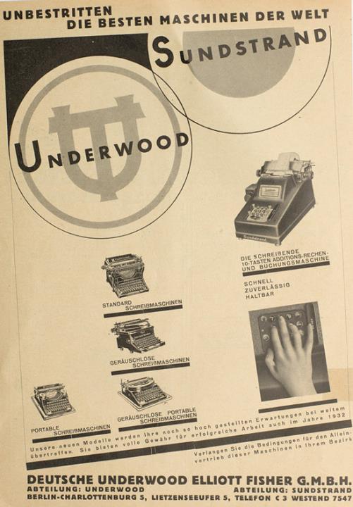 Werbeanzeige für Schreibmaschine Underwood und Rechenmaschine Sundstrand monochrom