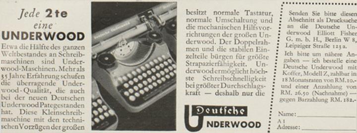 Werbeanzeige für Schreibmaschine Underwood monochrom
