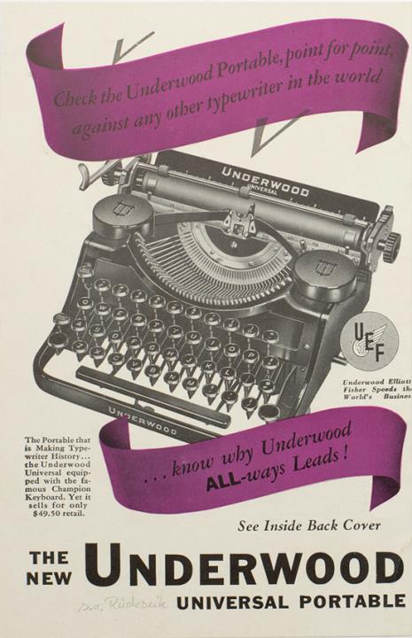 beidseitige Werbeanzeige für Schreibmaschine Underwood polychrom