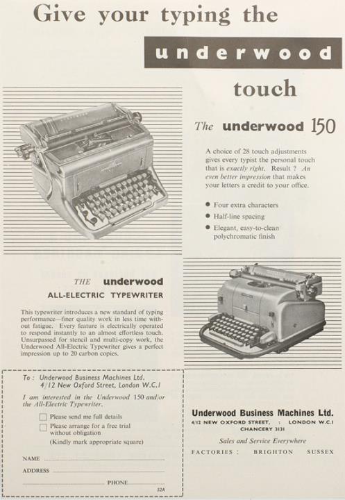 Werbeanzeige für Schreibmaschine Underwood 150 monochrom