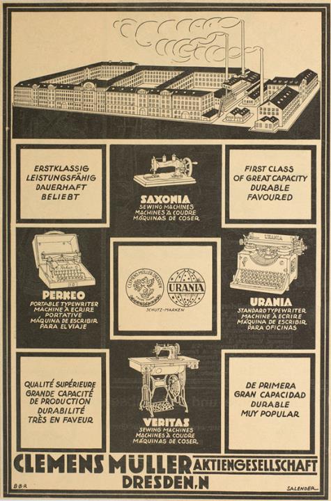 Werbeanzeige für Schreibmaschinen Urania und Perkeo sowie Nähmaschinen Saxonia und Veritas monochrom