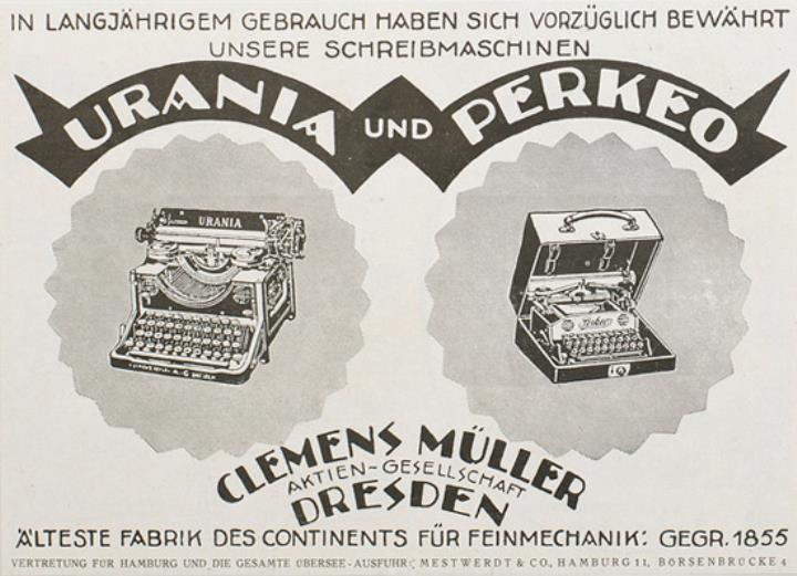 Werbeanzeige für Schreibmaschine Urania und Perkeo monochrom