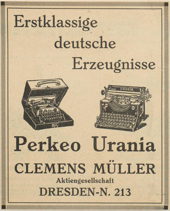 Werbeanzeige für Schreibmaschine Urania und Perkeo monochrom