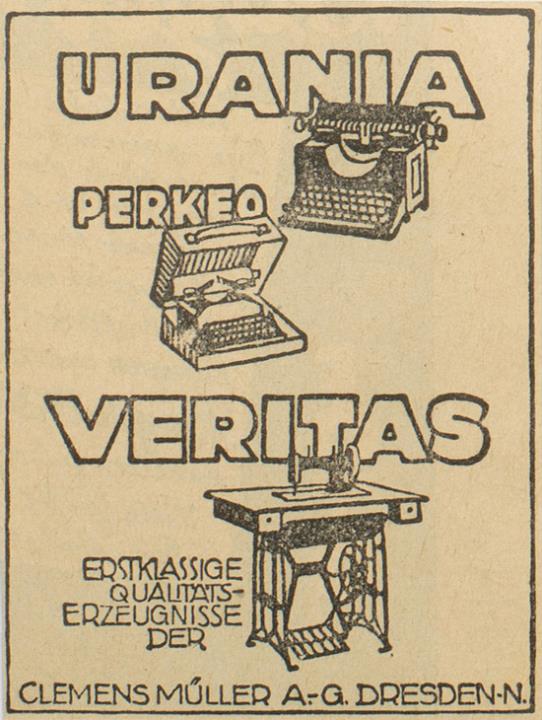 Werbeanzeige für Schreibmaschinen Urania und Perkeo sowie Nähmaschine Veritas monochrom