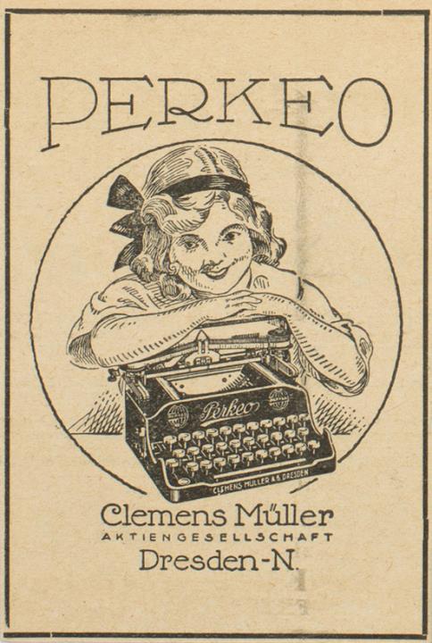 Werbeanzeige für Schreibmaschine Perkeo monochrom