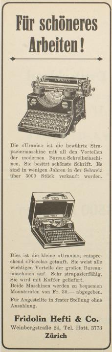 Werbeanzeige für Schreibmaschine Urania und Urania Piccola monochrom