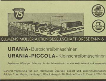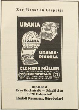 Werbeanzeige für Schreibmaschinen Urania monochrom