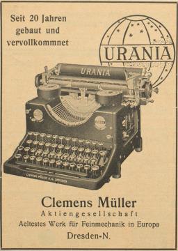 Werbeanzeige für Schreibmaschine Urania monochrom