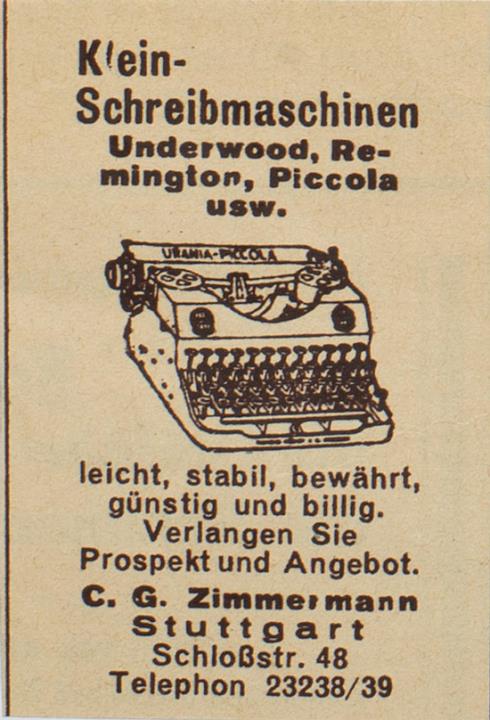 Werbeanzeige für Schreibmaschinenhandlung C. G. Zimmermann, Stuttgart monochrom