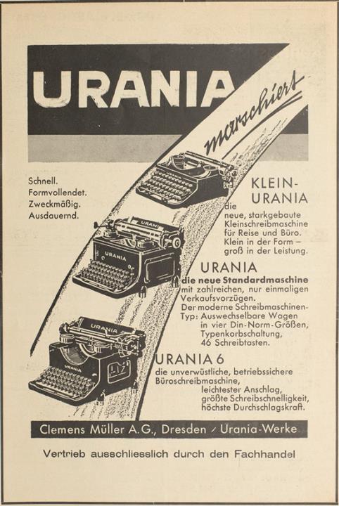Werbeanzeige für Schreibmaschinen Urania monochrom