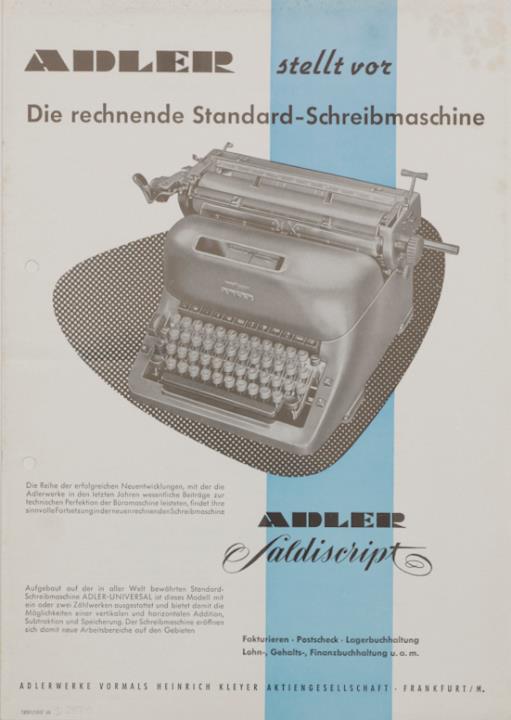 Prospekt für Schreibmaschine Adler Saldiscript. Adler stellt vor Die rechnende Standard-Schreibmaschine Nr. 12501/1057 (6)