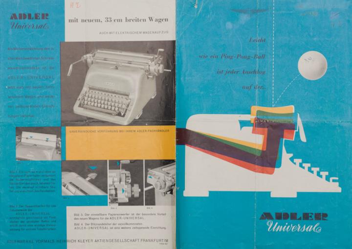 Faltprospekt für Schreibmaschine Adler Universal Leicht wie ein Ping-Pong-Ball ist jeder Anschlag auf der...Adler Universal Nr. 10506/457 Datum und Anmerkungen handschriftlich vermerkt