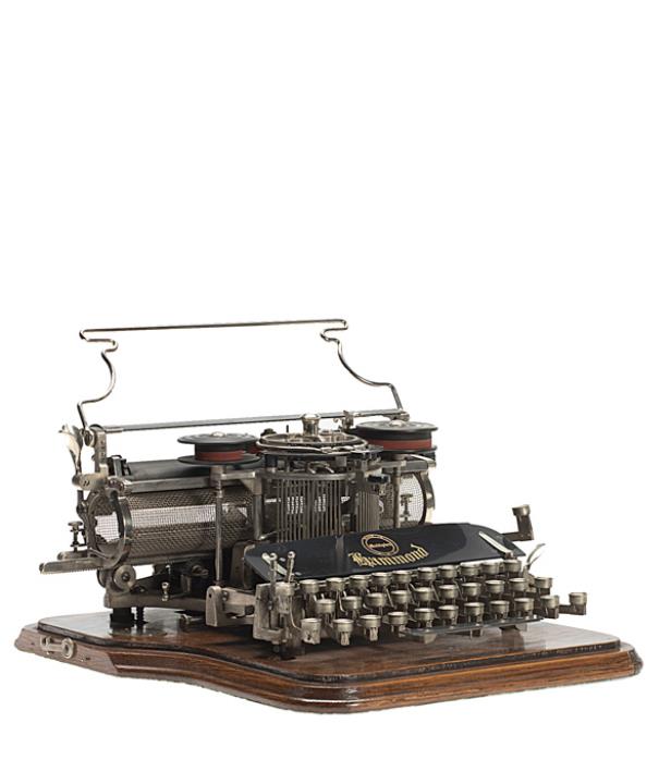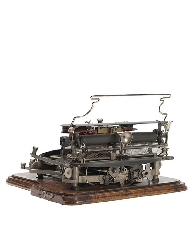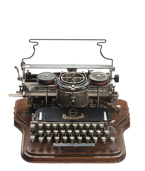 Schreibmaschine Hammond Modell Multiplex Mathematical; auf Unterboden der Holzabdeckung montiert Eigenschaften: Typensegment, Druckhammeranschlag, doppelte Umschaltung, 2 Umstelltasten, Farbband Tastatur: universal, dreireihig, 30 Schreibtasten Konstrukteur: James Bartlett Hammond Besonderheit: austauschbarer Typenträger; gleichzeitige Nutzung von zwei Schriftsätzen; Umsteller für Exponenten- und Nennerzeichen, Seriennummer R145270